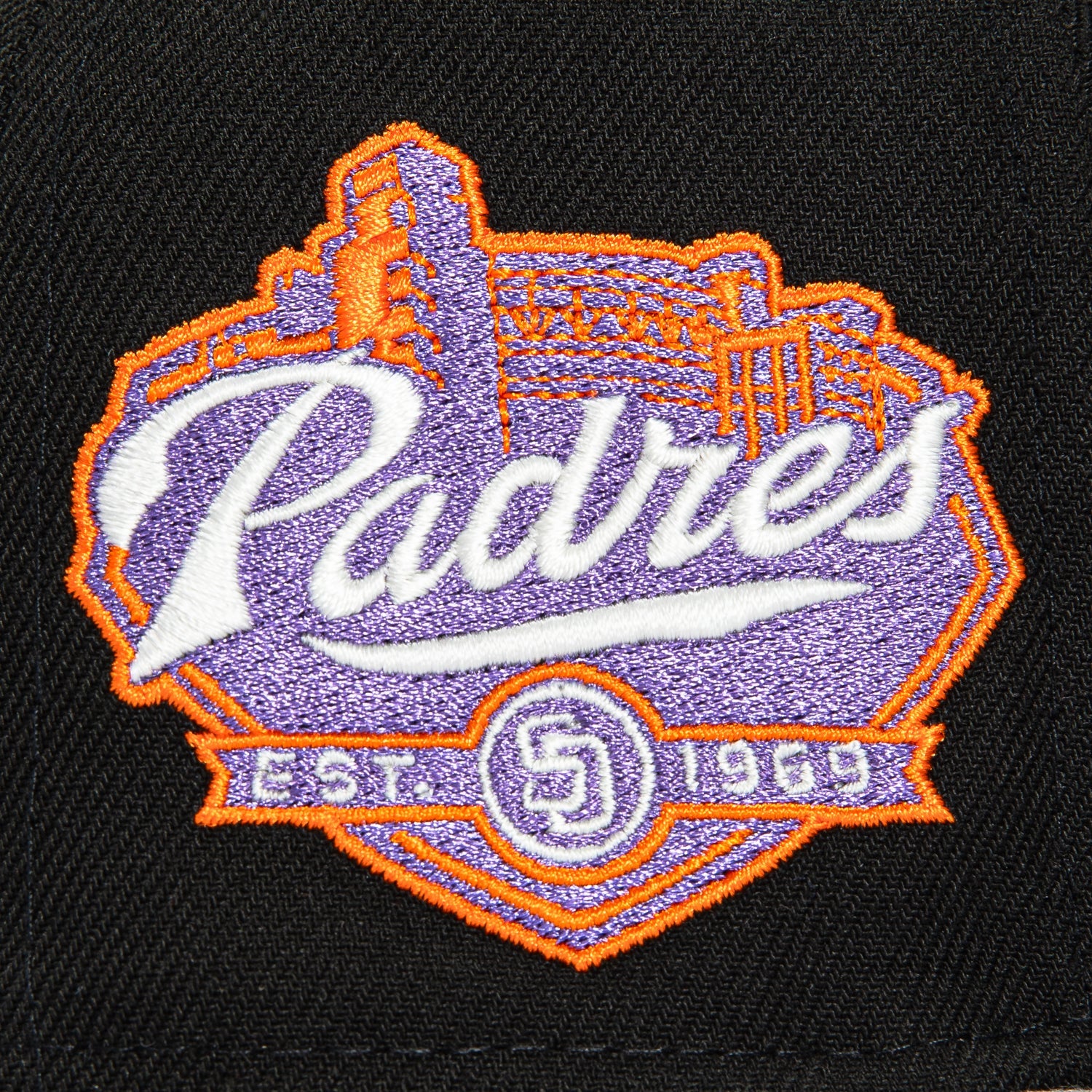 The San Diego Padres 59FIFTY Fitted Cap features an embroidered Padres script logo at the front panels with a matching MLB Batterman logo at the rear, a EST 1969 patch at the right-wear side, and a green undervisor.